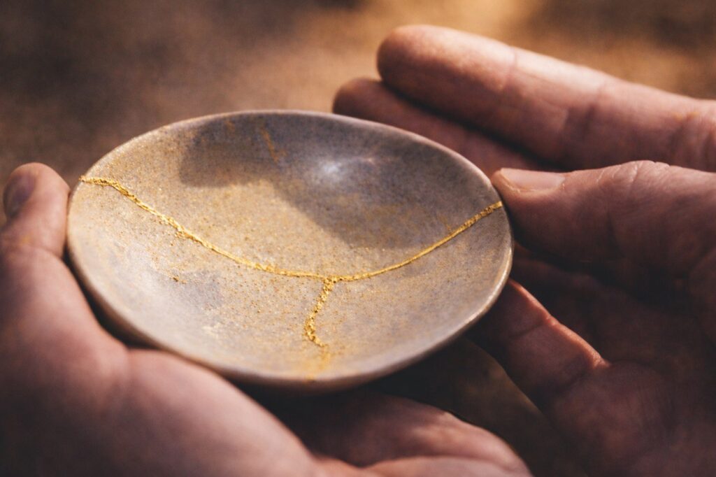 In der japanischen Kunst des Kintsugi werden Bruchstellen in Tongefäßen nicht verborgen. Sie bleiben sichtbar und werden in einem sorgfältigen handwerklichen Prozess mit edlen Materialien wie Gold oder Silber neu verbunden. Der Bruch gilt nicht als Mangel, sondern verleiht dem Gefäß seinen eigenen, unverwechselbaren Wert.