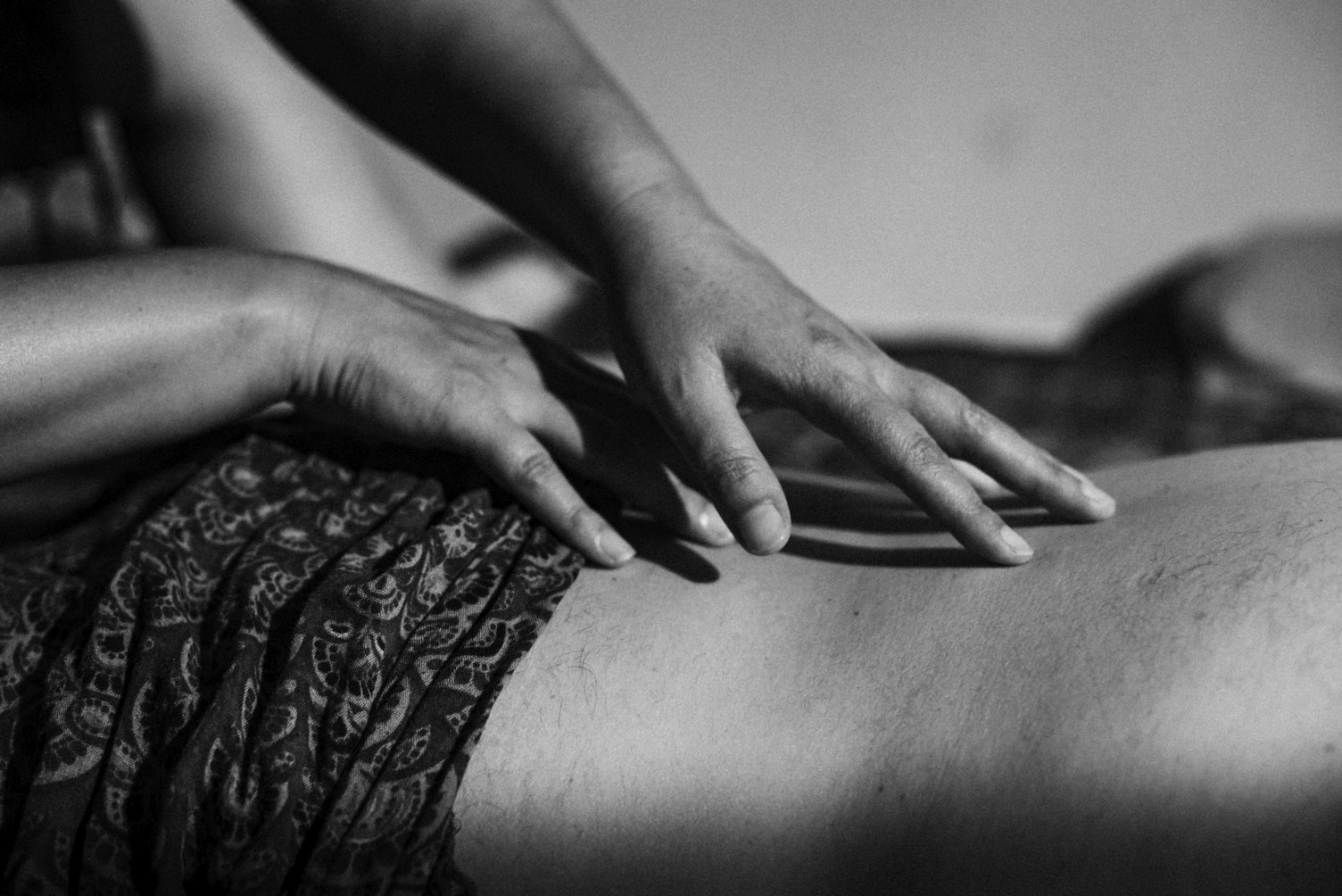 Die Massage beginnt meist in Rückenlage auf dem Futon und zunächst an der Peripherie: Gesicht, Kopf, Hände und Füße werden achtsam berührt. Von dort nähert sich die Berührung allmählich dem Rumpf an. Unterschiedliche Berührungsqualitäten kommen zum Tragen: sanfte Ausstreichungen, nährende Haltephasen, rhythmische Bewegungen, wechselnde Intensitäten, Momente von Stille sowie auch Body-on-Body-Elemente, bei denen Körper auf Körper ruht. Unsere Arbeit ist von den vier Elementen inspiriert. Leichte, zarte Berührungen öffnen den Raum des Atems und der Weite (Luft). Erdende, klärende Griffe vermitteln Halt, Sicherheit und Präsenz (Erde). Empfindungen und Emotionen dürfen sich zeigen und in Bewegung kommen (Wasser). Der bewusste Atem begleitet den gesamten Prozess.